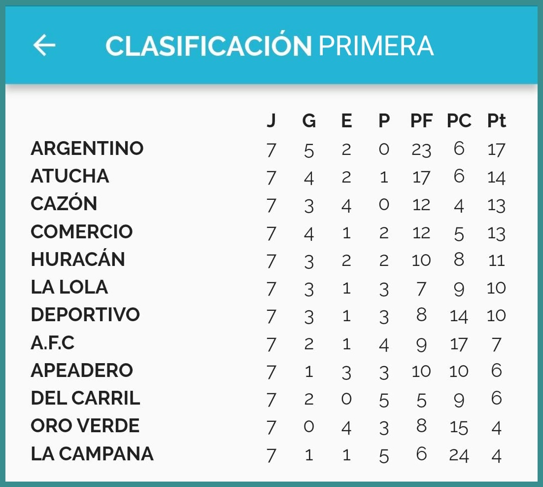 Se desarrolló este domingo la quinta fecha del Torneo Apertura para las categorías mayores. Luego de los resultados, la tabla en primera división la encabezan Argentino, Atucha y Cazón con 11 puntos, acomodándose bien luego de esta fecha, La Lola con 10 unidades.