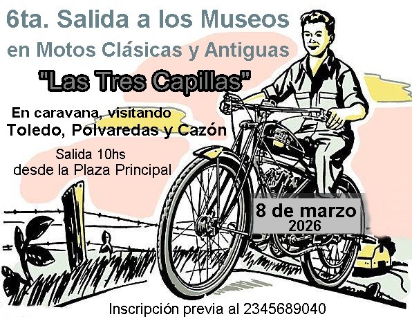 El club de Motos Clásicas y Antiguas de Saladillo, con el apoyo de la Dirección de Turismo municipal, organizan la Sexta Salida a los Museos en Motos, denominada en esta oportunidad "Las Tres Capillas".