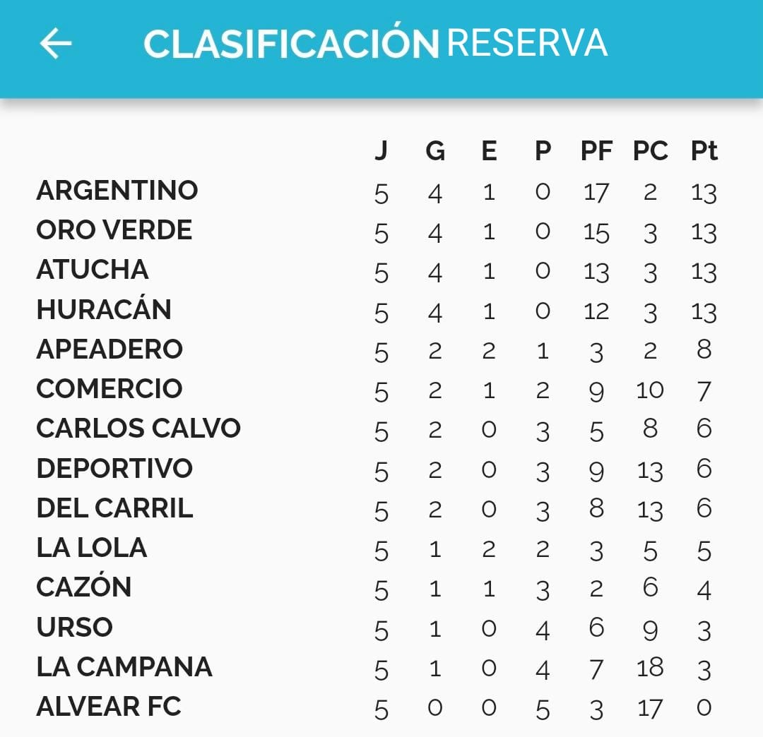 Argentino, Oro Verde, Atucha y Huracán son los punteros en la tabla de Reserva. Todos con 13 unidades, producto de cuatro triunfos y un empate.
