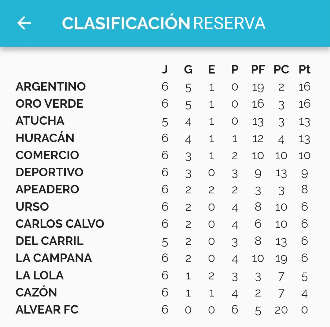 Los unicos invictos de Reserva son Argentino y Oro Verde, quienes ganaron sus respectivos encuentros de la sexta fecha y son los lideres de la tabla de posiciones.