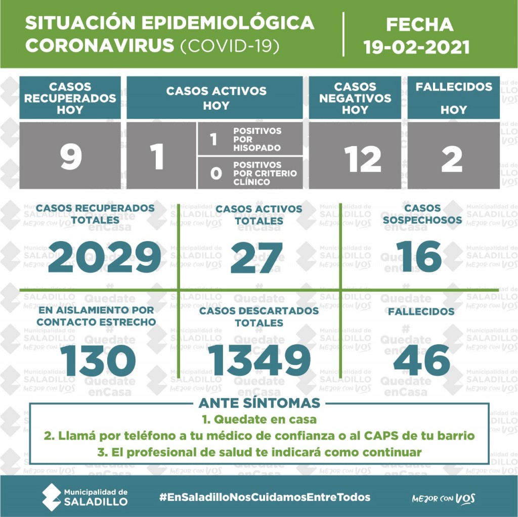 SITUACIÓN EPIDEMIOLÓGICA EN SALADILLO AL 19/02/2021