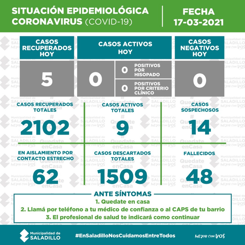 SITUACIÓN EPIDEMIOLÓGICA EN SALADILLO AL 17/03/2021