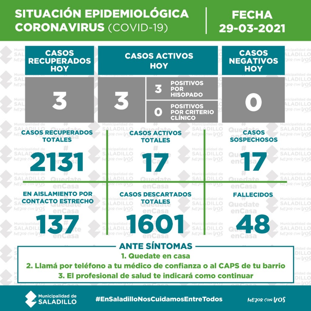 SITUACIÓN EPIDEMIOLÓGICA EN SALADILLO AL 29/03/2021