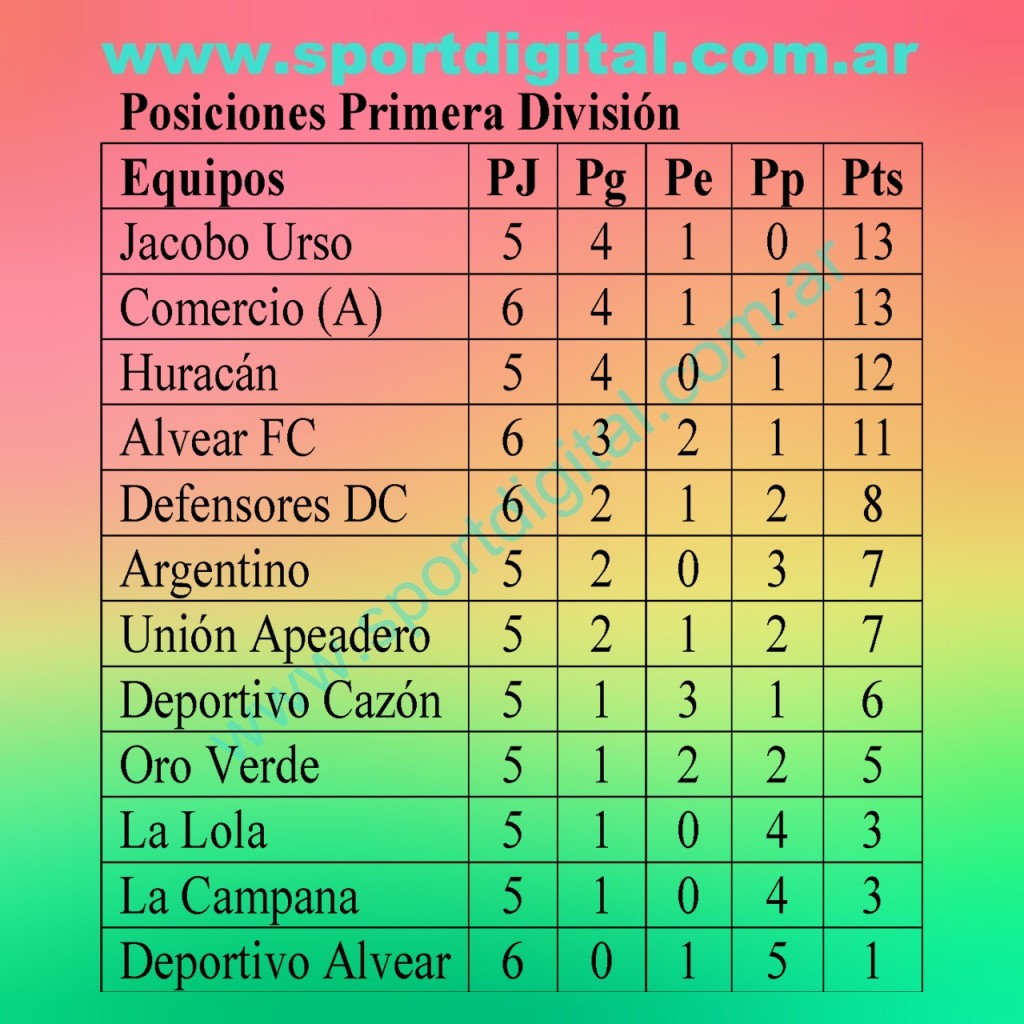 Este domingo se jugó parcialmente la sexta fecha del Torneo de fútbol de Primera división. Los dos partidos de los seis que debían disputarse se llevaron a cabo en General Alvear, en el estadio del CEF. En primer turno, Deportivo Alvear le gano al Alvear FC 2 a 0, mientras que en primera división se impuso Colorados por 3 a 2. Luego Defensores de Del Carril, en reserva, se quedó con la victoria ante Comercio por 2 a 1. Por ultimo en primera división se impuso Unión Empleados de Comercio a Del Carril por 2 a 1. Seguramente el próximo domingo se completarán los partidos restantes.