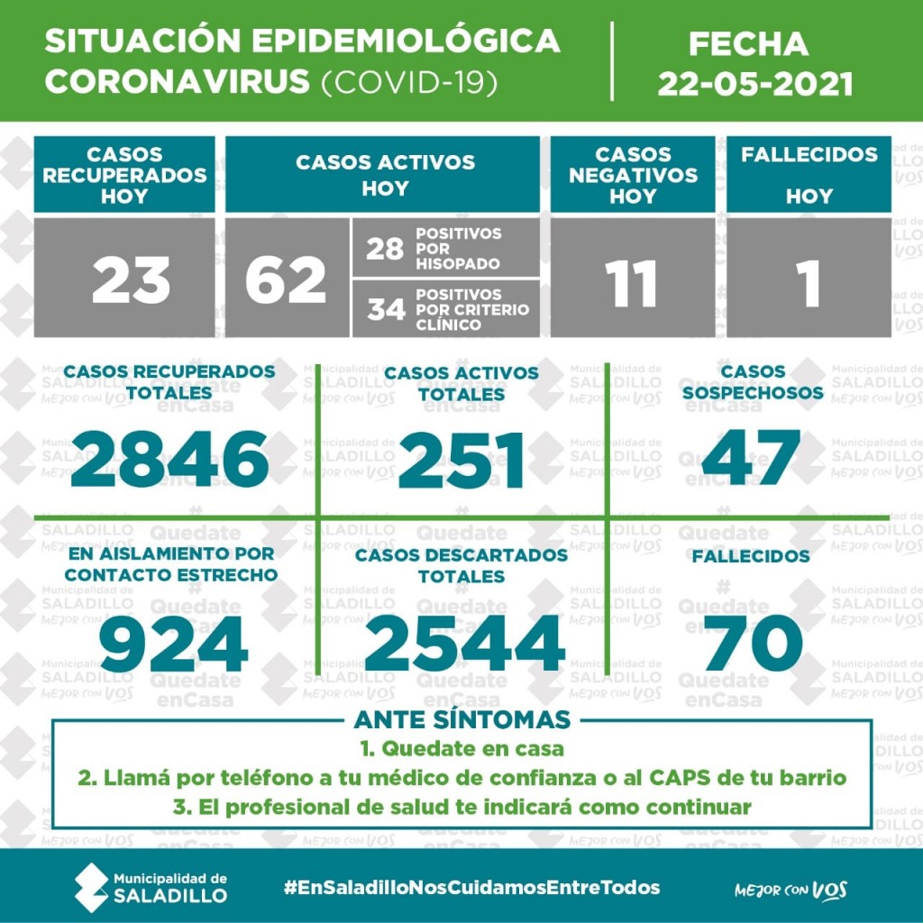 Saladillo: PARTE DIARIO POR CORONAVIRUS 22/05/2021