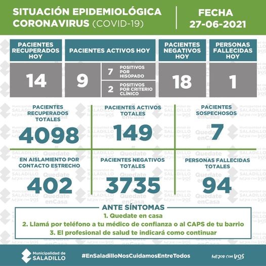 SITUACIÓN EPIDEMIOLÓGICA EN SALADILLO AL 27/06/2021
