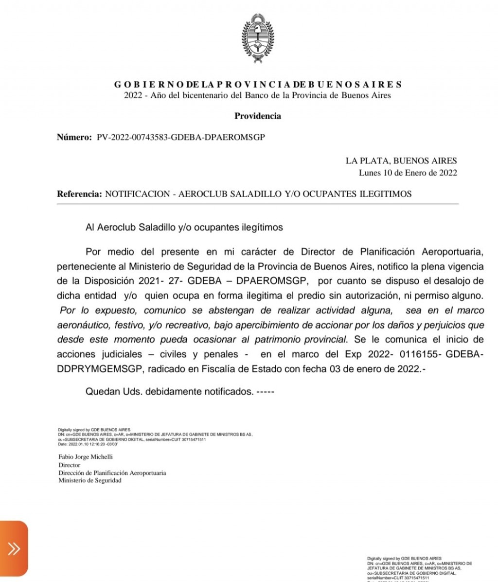 Por medio del presente en mi carácter de Director de Planificación Aeroportuaria, perteneciente al Ministerio de Seguridad de la Provincia de Buenos Aires, notifico la plena vigencia de la Disposición 2021- 27- GDEBA - DPAEROMSGP, por cuanto se dispuso el desalojo de dicha entidad y/o quien ocupa en forma ilegitima el predio sin autorización, ni permiso alguno.