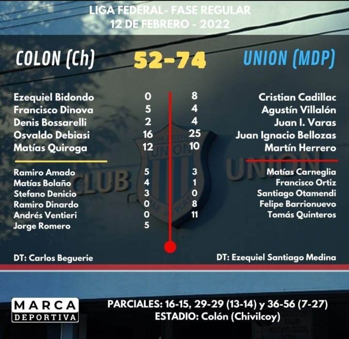 Por la tercera fecha de la Liga Federal de Básquet, Unión de Mar del Plata consiguió su primera victoria como visitante y fue en Chivilcoy ante Colón por 74-52.