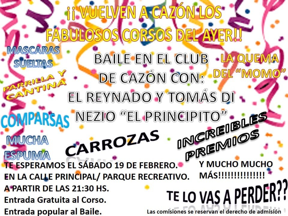 “Después de dos años parados por la pandemia, vuelven los Corsos a Cazón. Los esperamos a esta gran fiesta que tiene nuestro pueblo. Queres armar una carroza? Comunicate con nosotros y te asesoramos. ¡Gente a participar y a vivir la vida! Los esperamos este sábado 19 de febrero en la avenida principal. Cazón siempre para adelante”