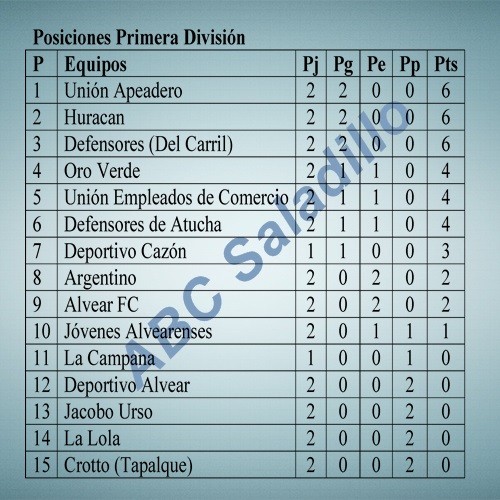 En Primera, Unión Apeadero, marca el rumbo con dos jugados y dos ganados, al igual que Huracán y Defensores de Del Carril, sumándose en esta ocasión Oro Verde que viene haciendo un buen torneo.