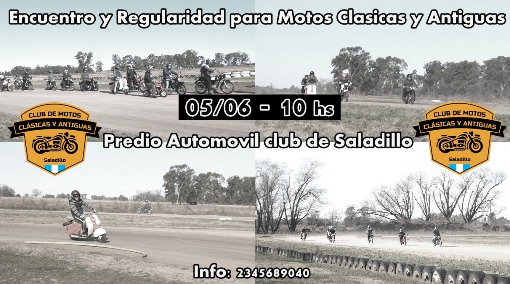 El club de Motos Clásicas y Antiguas de Saladillo se encuentra abocado a la realización de un Encuentro y Regularidad a realizarse el domingo 5 de junio en el predio del Automóvil club de Saladillo. Por este medio se invita a los propietarios de motos antiguas a participar de dicho evento como también al público en general, con entrada libre y gratuita. El parque cerrado se habilitará desde las 10, mientras que la primera actividad arrancará a partir de las 11. Habrá servicio cantina y carritos de comida. Informes al 2345689040, 2345 433644 o 2345425817.