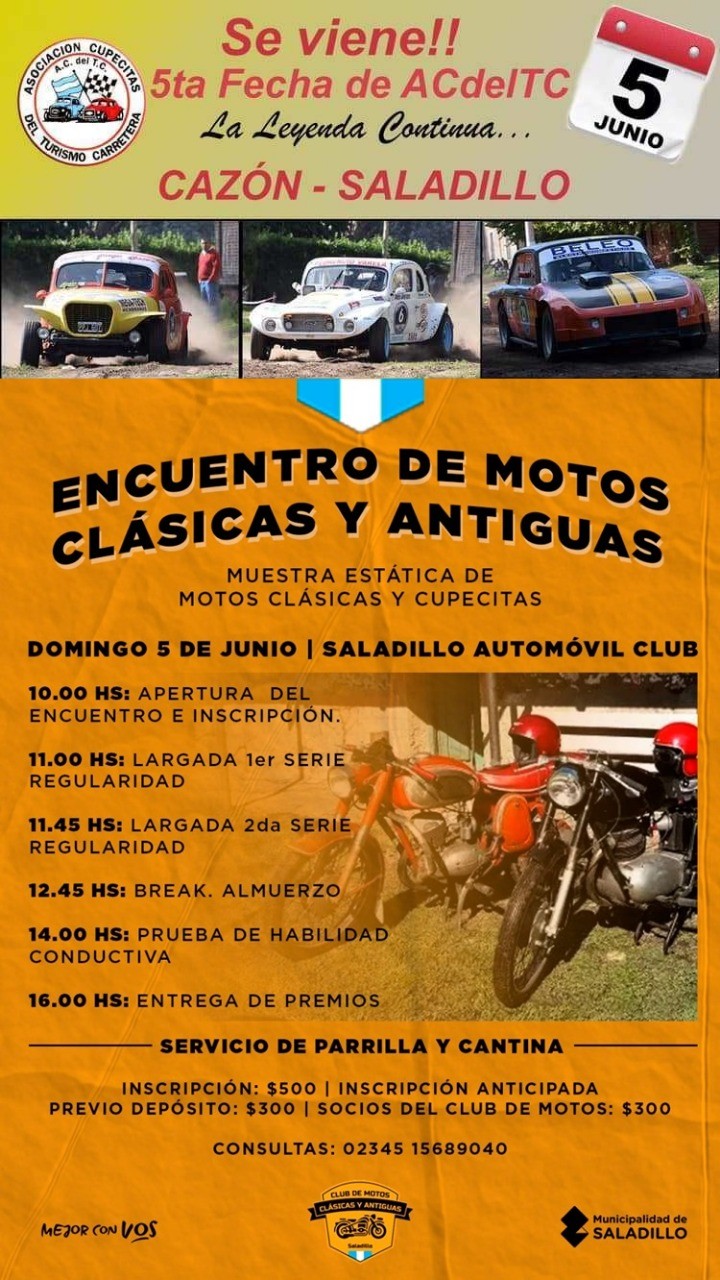 Este domingo en las instalaciones del Saladillo Automóvil Club se estará llevando adelante una excelente jornada con la actividad del club de Motos Clásicas y Antiguas de Saladillo y la Asociación Cupecitas del Turismo Carretera, con entrada libre y gratuita.