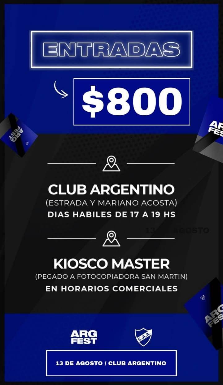 Entradas a la venta anticipadas en la sede del Club Argentino, Estrada y M. Acosta, de 17 a 19 horas.