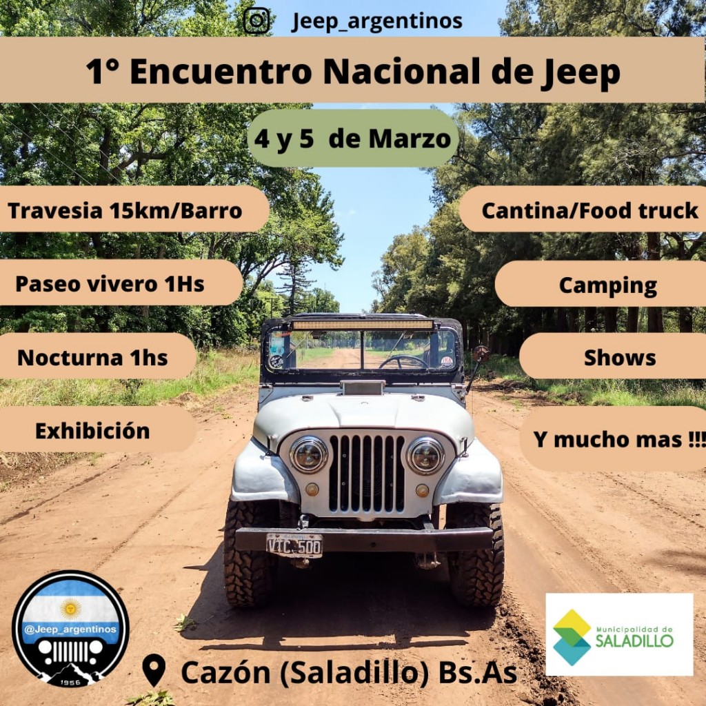 Este fin de semana la Base de Campamento de Cazón se transformará en la sede del Primer Encuentro Nacional de Jeep. El mismo estará organizado por @Jeep_Argentinos, página de Instagram referente de los usuarios de dicha marca. El cronograma contará con paseos, travesías offroad, shows en vivo, sorteos, cantina, patio de comidas y muchas sorpresas más.