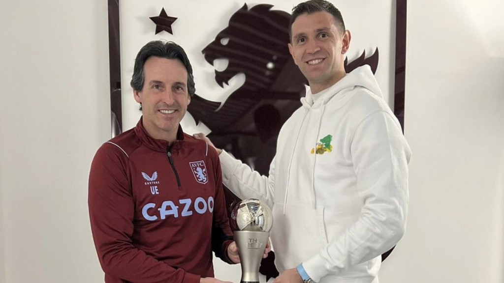 Emiliano "Dibu" Martínez, campeón del mundo en Qatar 2022, se reintegró al plantel de Aston Villa de Inglaterra y posó con el premio The Best junto con su entrenador, el español Unai Emery.
