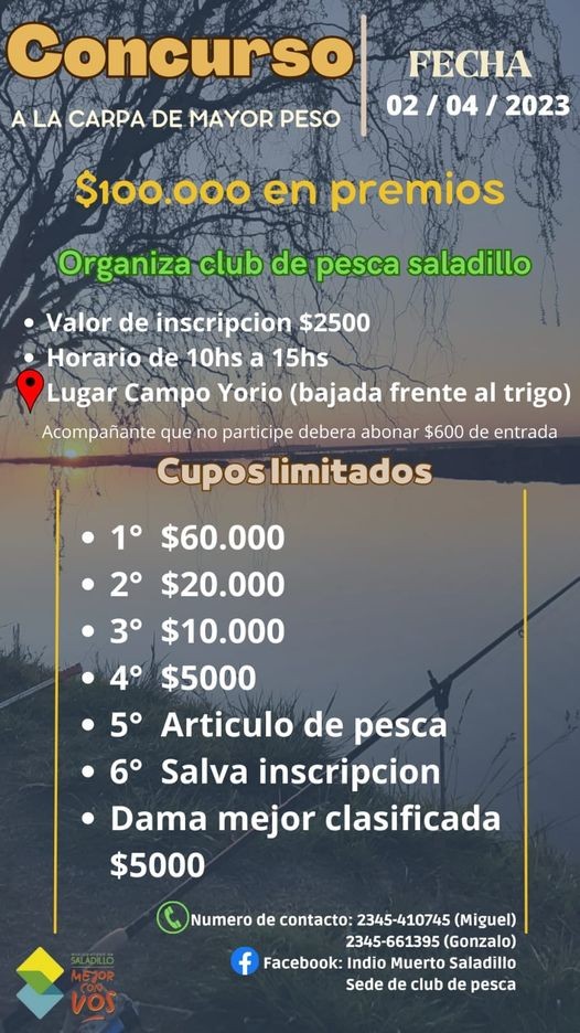 Organizado por el club de Pesca Saladillo, se realizará el domingo 2 de abril un Concurso a la Carpa de mayor peso en el Arroyo Las Flores, con 100.000 pesos en premios. Valor de la Inscripción: $ 2500 (Acompañantes $ 600). Horario de 10 a 15hs. Lugar: Campo Yorio (Bajada frente a El Trigo).