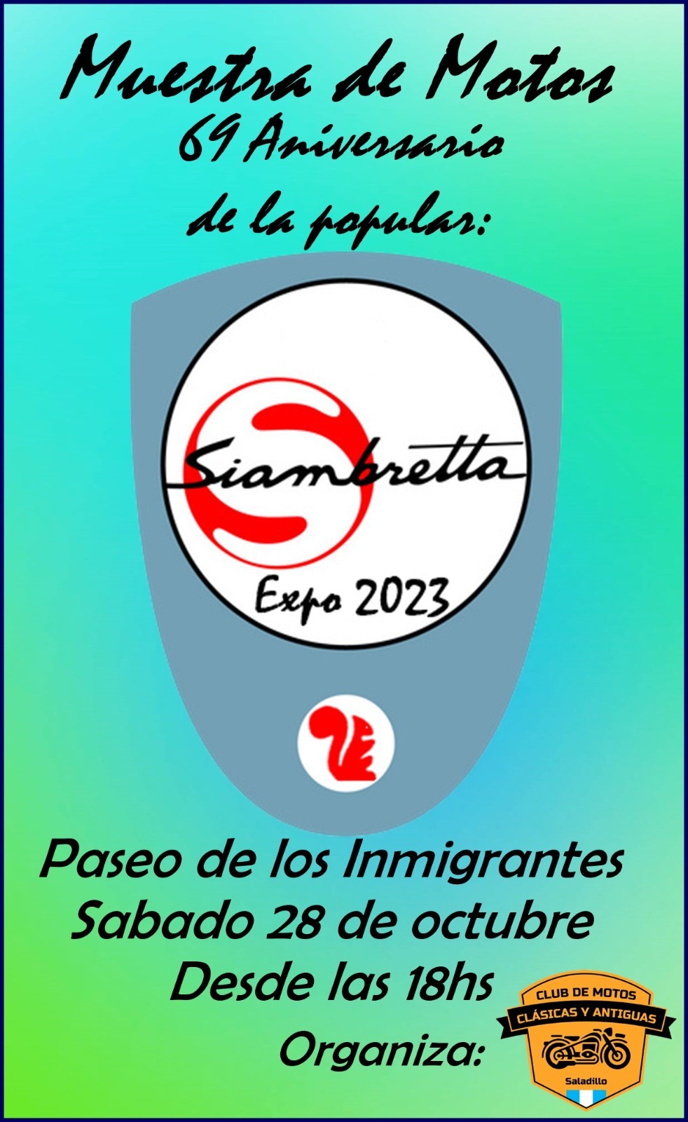 El club de Motos Clásicas y Antiguas de Saladillo convoca a propietarios de motonetas Siambretta, en cualquier estado, andando o no. La misma es para realizar una exposición estática con motivo del 69° Aniversario de la emblemática moto. La exposición se realizará el sábado 28 de octubre en el Pasaje de los Inmigrantes (Media luna de la Estación de Trenes) desde las 18 horas. Para más información contactarse al 2345689040 o pasar por Moreno y Posadas (Gomería).