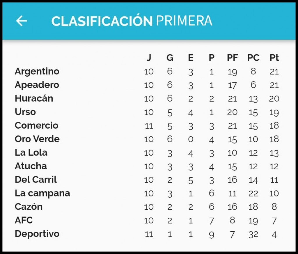 Resultados y Posiciones Fecha 11° - Argentino y Apeadero en lo más alto de la tabla