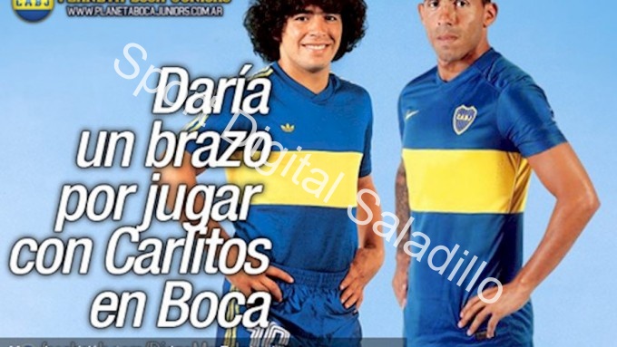 Maradona, de 55 años, publicó en su cuenta oficial de la red social Facebook una fotografía que unió, mediante el uso de la tecnología, a ambos ídolos de Boca con la leyenda: "Daria un brazo por jugar con 'Carlitos' en Boca".