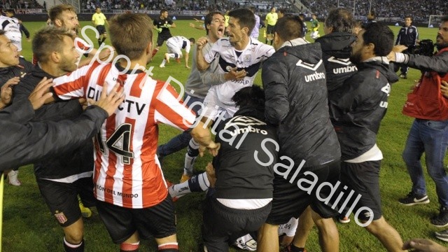 Fue entonces cuando se comenzó a gestar el bochorno. Suplentes y cuerpos técnicos invadieron la cancha y el control se perdió pro completo: a Israel Damonte le lanzaron un golpe a traición, Mariano Andújar se plantó y comenzó a tirar piñas en cuanto rostro rival se le cruzaba, pero al caer al piso fue Mazzola quien lo agarró a patadas en la cara.