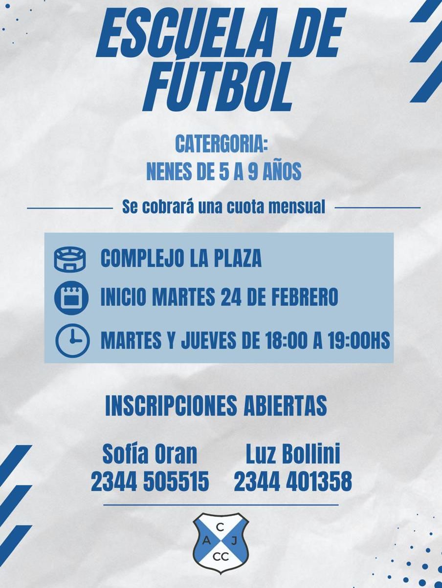 El Club CJA Carlos Calvo informa que se encuentran abiertas las inscripciones para la Escuela de Fútbol destinada a niños de 5 a 9 años. Las actividades se desarrollarán en el Complejo La Plaza, comenzando el martes 24 de febrero, los días martes y jueves de 18:00 a 19:00 horas. Se cobrará una cuota mensual.