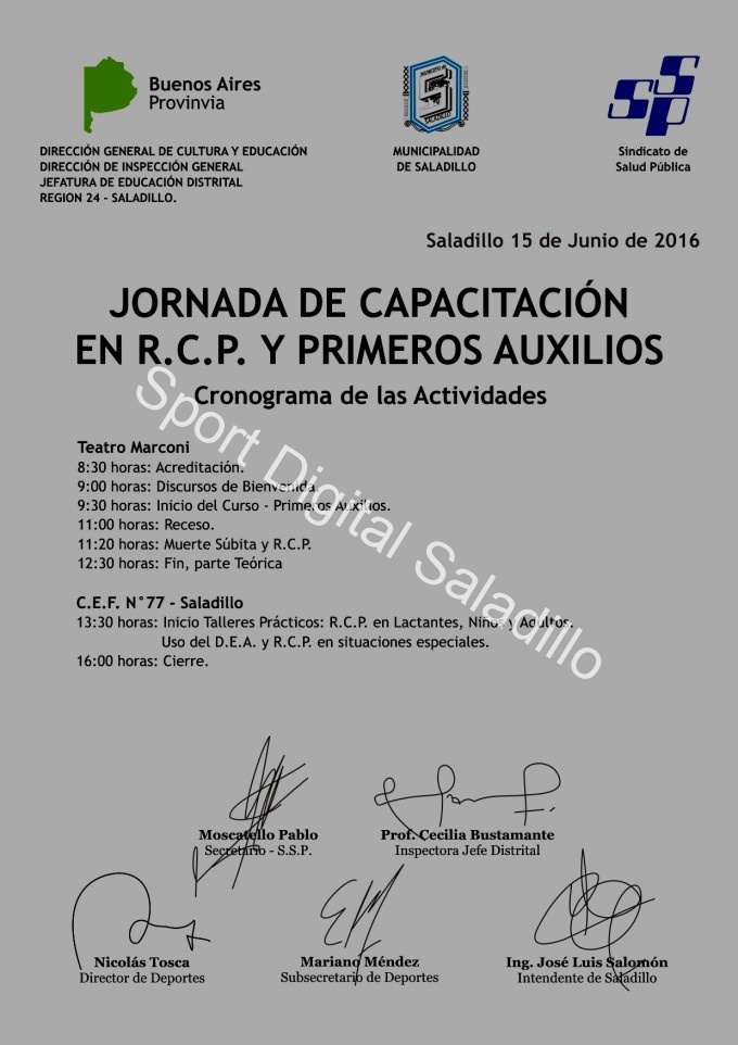 La Municipalidad de Saladillo, el Sindicato de Salud Pública y la Jefatura de Educación Distrital, organizan para mañana, miércoles 15 de junio una Jornada de RCP y Primeros auxilios, en el Teatro Marconi a partir de las 8:30 y en el CEF 77 desde las 13:00. Lo anunciaron ayer el Director del Hospital Posadas, doctor Martín Carrera; el director asociado del Posadas, licenciado Raúl Astudillo; la Inspectora Jefa Distrital, profesora Cecilia Bustamante; el Subsecretario de Deportes y Recreación profesor Mariano Méndez; el secretario del Sindicato de Salud Pública de Saladillo, Pablo Moscatello y el inspector distrital de Educación Física, profesor Pablo Pesaresi.