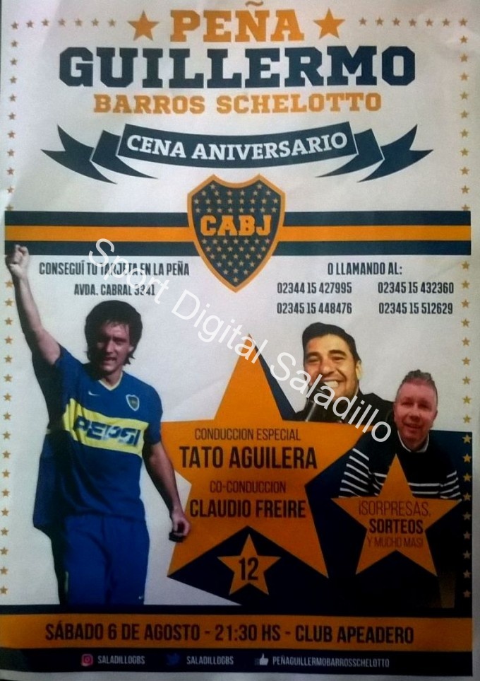 La gente de la peña boquense “Guillermo Barros Scheletto” se encuentra abocada a ultimar detalles de lo que será su primera cena Aniversario en Saladillo para este sábado en el club Apeadero. Es por ello que debido a que quedan pocas tarjetas a la venta, convocan a los interesados en participar de la misma para acercarse a la sede el martes, miércoles o jueves de 17 a 19, ubicada en Cabral 3341 e inclusive también el jueves de 9 a 11 de la mañana.