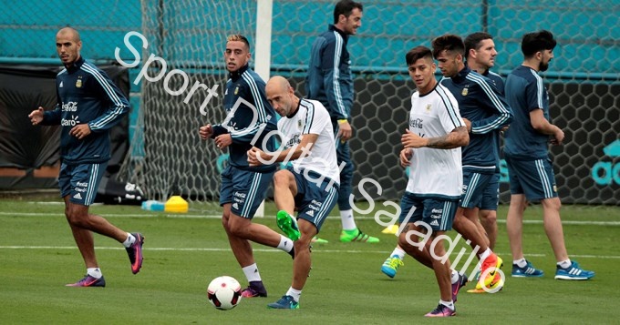 Los 12 que empezaron a realizar trotes en derredor del terreno de juego fueron los tres arqueros, Sergio Romero, Nahuel Guzmán y Mariano Andújar, quienes luego se movieron aparte con el nuevo entrenador de guardavallas, Gustavo Campagnuolo, junto a Pablo Zabaleta, Marcos Rojo, Guido Pizarro, Emmanuel Mas, Lucas Alario, Angel Di María, Lucas Pratto y Ramiro Funes Mori, que hicieron posteriormente trabajos de dominio de balón en un rectángulo, mientras que Nicolás Otamendi hizo trabajo diferenciado por una molestia en el tobillo izquierdo junto al kinesiólogo Luis García.