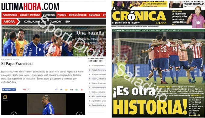 A su turno, ABC Color señaló "El papa Francisco", alusión al nombre del entrenador "Chiqui" Arce, al que se indicó como "el entrenador que quedará en la historia contra Argentina. Armó un equipo rápido pero joven. Lo planeado salió y terminó rompiendo la historia contra los argentinos de visitante: somos todos paraguayos y tenemos que disfrutar".