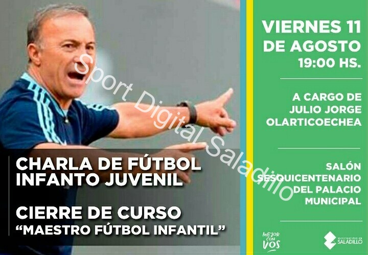 Julio Jorge Olarticoechea dará una charla de fútbol infanto juvenil en el Palacio Municipal de Saladillo. Sera en el cierre del curso "Maestro de Fútbol Infantil". La misma tendrá lugar este viernes 11 de agosto a las 19 hs. en el Salón Sesquicentenario del Palacio Municipal de Saladillo. Además de los concursantes podrán participar Profesores de Educación Física, Técnicos de Fútbol y allegados.