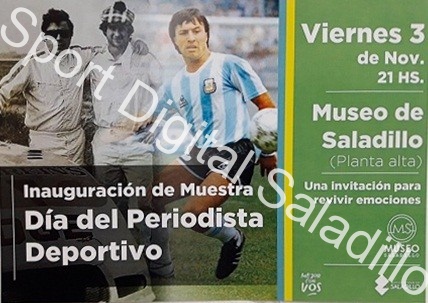 Del 3 al 10 de noviembre se realizará una muestra de fotos y objetos deportivos en el Museo de Saladillo por el Día del Periodista Deportivo. La inauguración será el 3 desde las 21 horas. Por este medio se invita a todos los colegas, deportistas, exdeportistas, dirigentes y vecinos de Saladillo a participar de la apertura y visitar la misma. La muestra es organizada por el museo en conjunto con periodistas locales, donde entre otras cosas se podrá encontrar la Copa del Mundo México 1986, además de camisetas, accesorios deportivos y fotos.