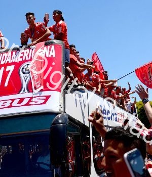 El flamante campeón de la Copa Sudamericana fue recibido por cientos de hinchas en el Aeroparque Metropolitano, de donde salió en Caravana hacia el estadio Libertadores de América.