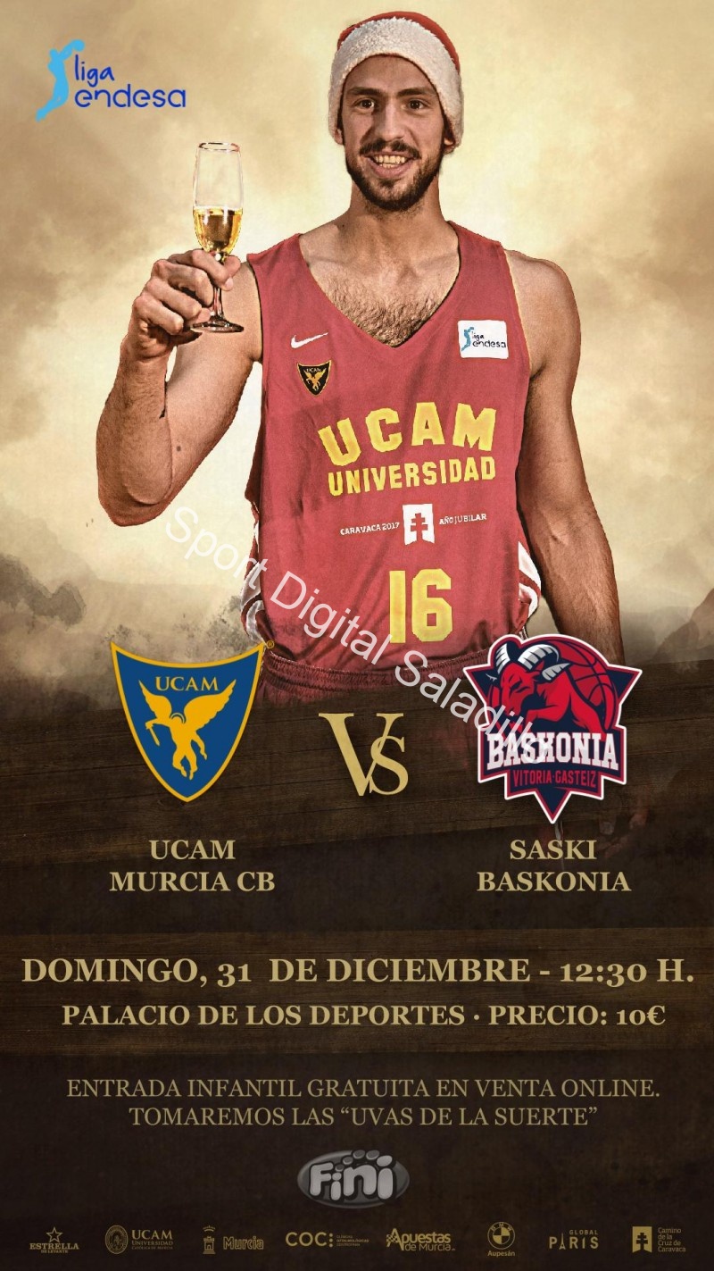 El UCAM Murcia, donde milita el saladillense Marcos Delía, cierra el año con un plato fuerte y postre incluido. Este domingo, a las 12:30 horas, recibirá en el Palacio de los Deportes al Baskonia, uno de los denominados equipos fuertes, de la Liga Endesa. Se trata del último partido del año para ambos conjuntos y posiblemente represente una de las llaves que el conjunto murciano necesita para abrir la puerta de la Copa. El conjunto que dirige Ibon Navarro se caracteriza por su capacidad para competir y aunque lo hace mejor a domicilio que de local, en esta ocasión tendrá que ofrecer algo más para doblegar a un rival que llega a Murcia en racha.