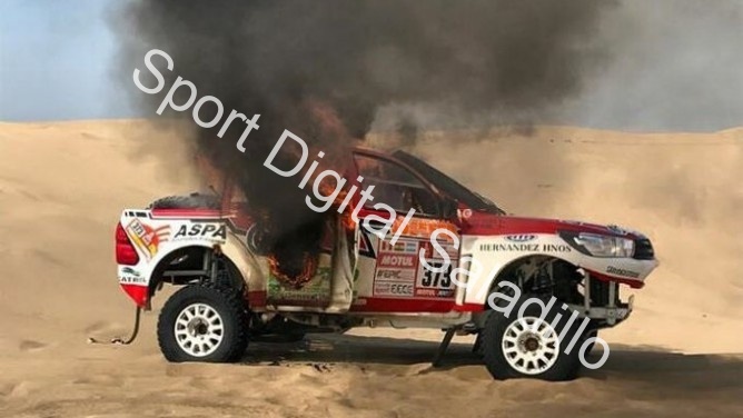 La camioneta se incendió durante el desarrollo del tramo entre Pisco y San Juan de Marcona, destruyendo en gran parte a la unidad y obligándola a desertar de esta edición del Dakar 2018 Perú/Bolivia/Argentina