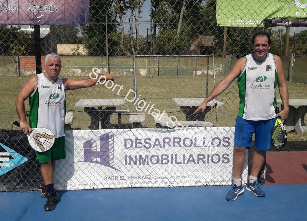 El "Expreso" se quedó con la revancha. Hernaez - Bercini vencieron a Ferreyra - Mazza por 7/5 - 6/4. En la foto con el cartel del próximo sponsors de SDS.