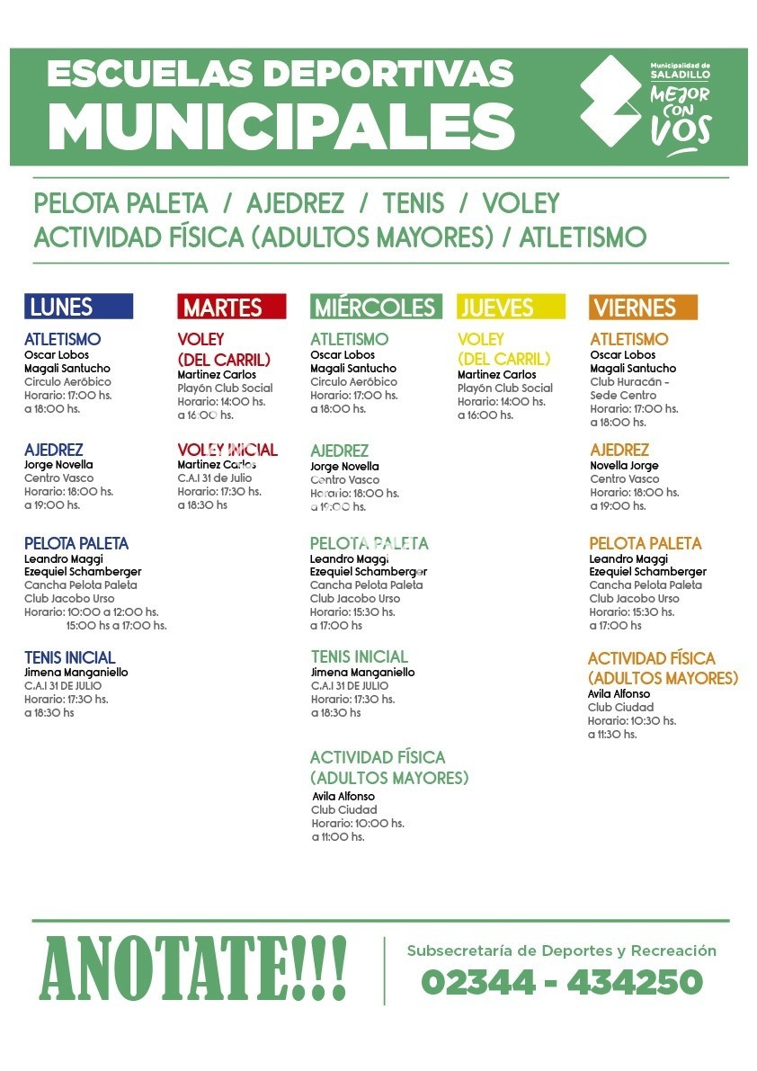 La Subsecretaría de Deportes informa las disciplinas en que se pueden inscribir para asistir a las Escuelas Deportivas Municipales de Saladillo.