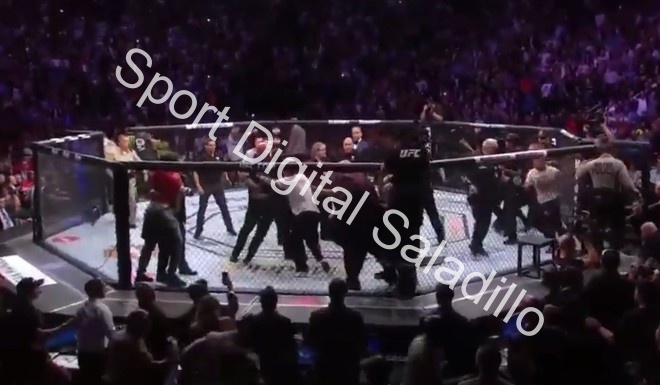 El ganador dio y recibió varias piñas antes de que los de seguridad lograran frenarlo. Sin embargo no terminó ahí, porque su equipo también repartió: se metieron a la arena y empezaron a darle por la espalda a McGregor, que atinó a defenderse. Todo culminó en una batalla de todos contra todos, adentro y afuera del octágono.