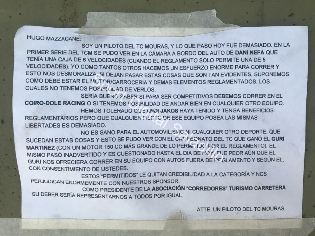 Parecía que sería una mañana más en el autódromo de La Plata para el TC Mouras. Sin embargo, comenzó movida por un papel escrito por un piloto anónimo de la categoría. En el documento se realizó una fuerte acusación poniendo en tela de juicio la victoria en la serie del sábado de Daniel Nefa y al equipo Dole Racing. Ese papel apareció en los boxes de los equipos y está dirigido expresamente al presidente de la ACTC, Hugo Mazzacane. El mismo dice lo siguiente: “Soy un piloto del TC Mouras y lo que pasó hoy fue de demasiado. En la primera serie del TCM se pudo ver en la cámara a bordo del auto de Dani Nefa que tenía una caja de 6 velocidades (Cuando el reglamento sólo permite una de 5 velocidades). Yo como tantos otros hacemos un esfuerzo muy enorme para correr y esto nos desmoraliza. Si dejan pasar estas cosas que son tan evidentes, suponemos como debe estar el motor/carrocería y demás elementos reglamentados, los cuales no tenemos posibilidad de verlos”, señala en el primer párrafo este documento. A su vez, dice: “Sería bueno saber si para ser competitivos debemos correr en el Coiro-Dole Racing o si tenemos posibilidad de andar bien en cualquier otro equipo. Hemos tolerado que Andi Jakos haya tenido y tenga beneficios reglamentarios pero que cualquier piloto de ese equipo posea las mismas libertades es demasiado”.