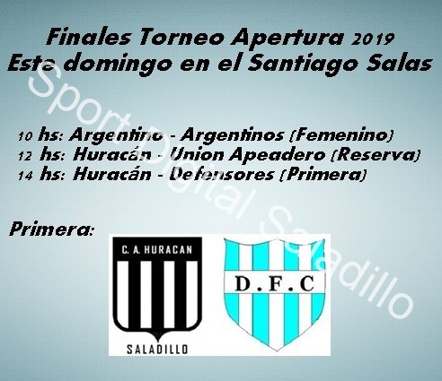 La jornada se iniciará desde las 10 con la final del Fútbol Femenino entre Argentino de Saladillo y Argentinos de 25 de Mayo. Luego continuará desde las 12 horas con la primera final de Reserva, entre Huracán y Unión Apeadero, finalizando desde 14 con el plato fuerte del programa, el partido de ida por la final de Primera División entre Huracán de Saladillo y Defensores de Del Carril.