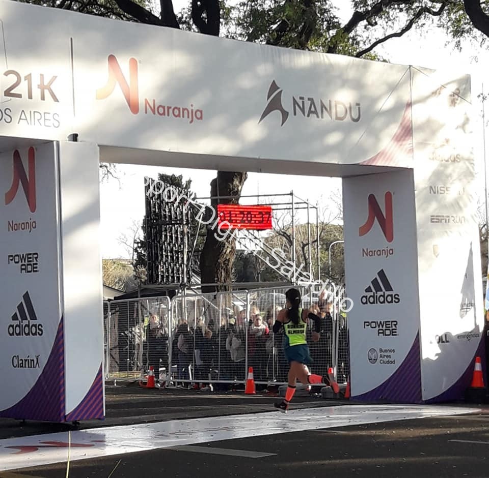 “Se corrieron este domingo los 21k de BA, esta vez me tocó largar en línea de largada élite, muy contenta con el resultado pude bajar mi marca personal del Ranking argentino, 1h22m05s. Por suerte salió una linda carrera, donde pude correr a un ritmo de 3:49/k, llegando a la meta con un tiempo oficial de 1h20m33s, donde me ubique en la general Damas en el puesto 15, sexto puesto mejor de Argentina y cuarto puesto en mi categoría. Quiero agradecer a Mi entrenador Rubén Perazzo , a mi equipo de Running Almirón, a saturnargentina.com.ar, Fabián Lavalle, Indumentaria Deportiva Bloom, Osvaldo Luis Debiasi y a la Secretaría de Deportes de Saladillo”