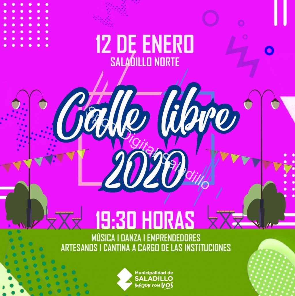 El domingo 12 de enero, en Saladillo Norte, se realizará Calle Libre a partir de 19.30 horas. Música, Danza, Emprendedores, Artesanos. Cantina a cargo de instituciones.