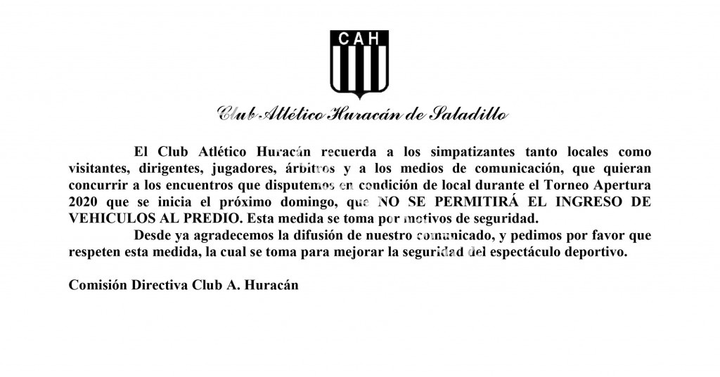 El Club Atlético Huracán recuerda a los simpatizantes tanto locales como visitantes, dirigentes, jugadores, árbitros y a los medios de comunicación, que quieran concurrir a los encuentros que disputemos en condición de local durante el Torneo Apertura 2020 que se inicia el próximo domingo, que NO SE PERMITIRÁ EL INGRESO DE VEHICULOS AL PREDIO. Esta medida se toma por motivos de seguridad.