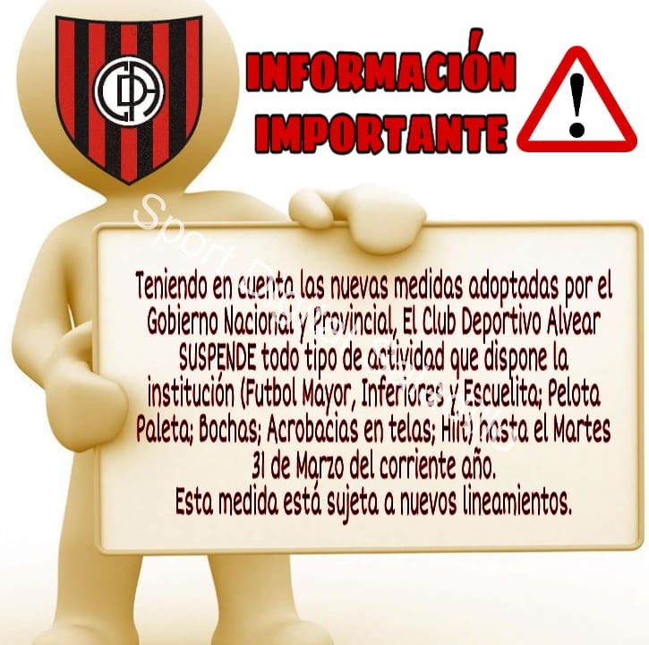 Teniendo en cuenta las nuevas medidas adoptadas por el Tobierno Nacional y Provincial, el Club Deportivo Alvear SUSPENDE todo tipo de actividad que dispone la institución (Futbol Mayor, Inferiores y Escuelita; Pelota Paleta; Bochas; Acrobacias en telas; Hiit) hasta el martes 31 de Marzo del corriente año.