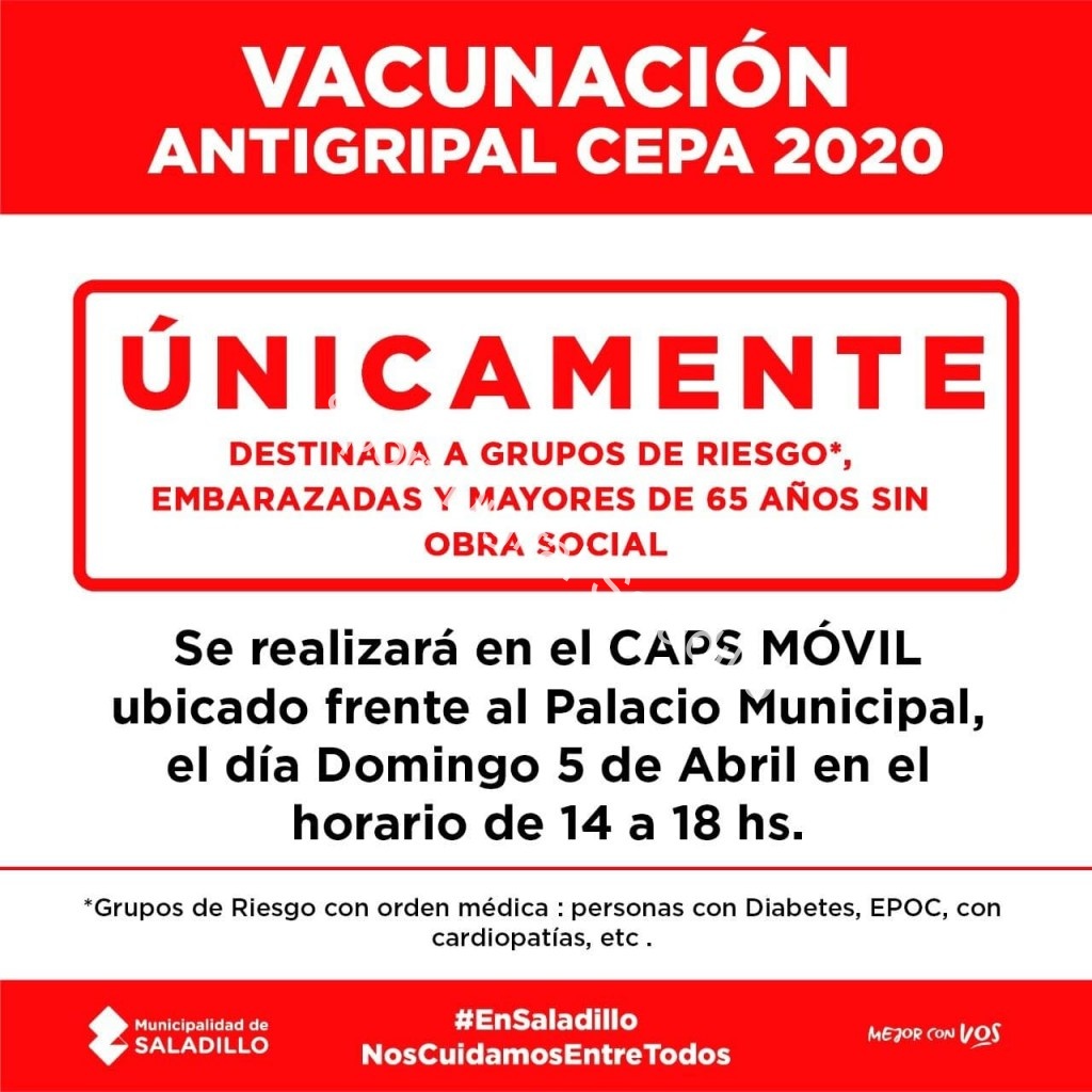 La Municipalidad de Saladillo, a través de la Subsecretaria de Salud, comunica a la población que este domingo 5 de abril en el horario de 14 a 18hs continuará la vacunación antigripal en el CAPS móvil ubicado frente al Palacio Municipal.