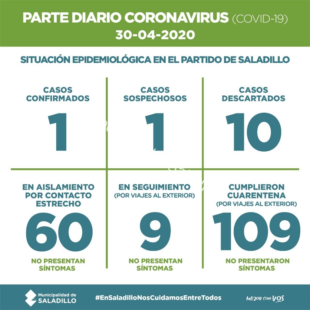 SALADILLO: PARTE DIARIO POR CORONAVIRUS 30/04/2020
