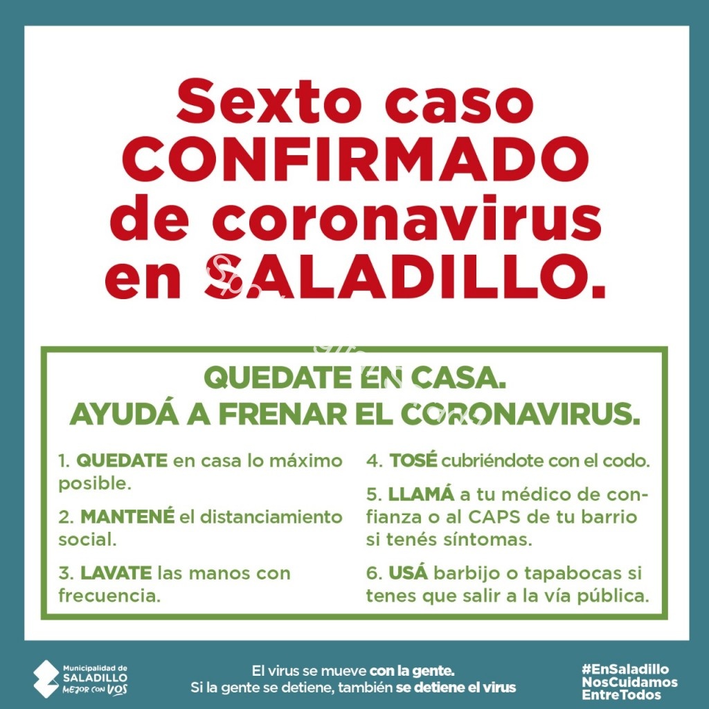 Este caso tiene nexo con la mujer de 31 años que también ha sido caso confirmado. SEXTO CASO CONFIRMADO DE CORONAVIRUS EN SALADILLO Nuevo caso confirmado recientemente, sería el sexto caso de COVID-19 en nuestra localidad. Se trata de un hombre de 61 años que permanece en aislamiento domiciliario. Cabe aclarar que esta persona era contacto estrecho de otros 2 casos positivos confirmados anteriormente. PEDIMOS A LA COMUNIDAD EXTREMAR LOS CUIDADOS Y MEDIDAS PREVENTIVAS. #QuedateEnCasa #EnSaladilloNosCuidamosEntreTodos #MunicipalidadDeSaladillo #MejorConVos