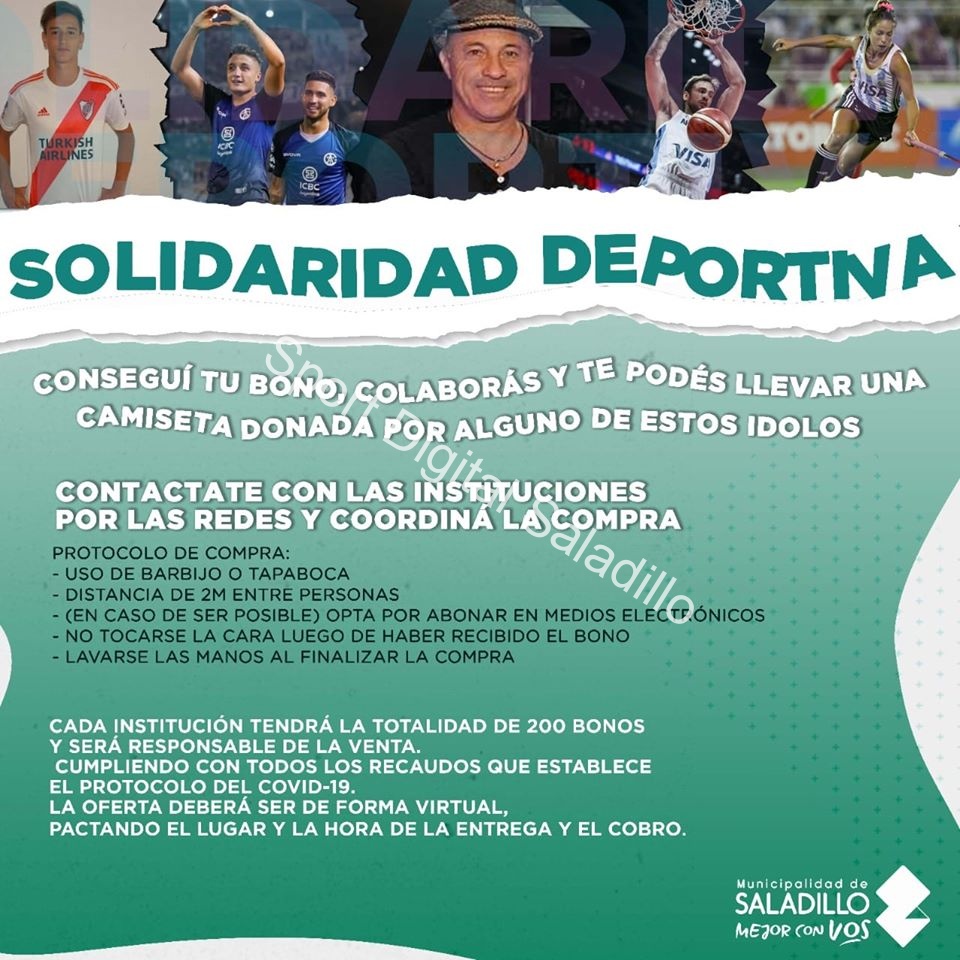 *SE EXTIENDE EL PLAZO DE VENTA DE BONOS SOLIDARIOS* La Sub Secretaria de Deportes y Recreación informa que en conjunto con los directivos de las 22 instituciones Deportivas, decidieron extender el plazo de venta de los Bonos Solidarios y hacer el cierre y sorteo el día Domingo 28 de Junio del corriente. Sumate a esta campaña solidaria adquiriendo un bono y te podes llevar una camiseta donada por alguno de estos ídolos. #QuedateEnCasa #EnSaladilloNosCuidamosEntreTodos #MunicipalidadDeSaladillo #MejorConVos