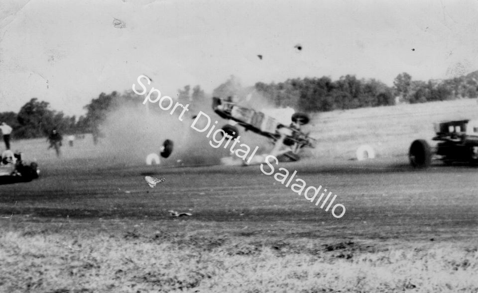La largada fue caótica, llegando todos juntos y muy rápidos a la primera curva, varios toques y el auto de Carpincho que se engancha con otro y vuelan por el aire (foto), ambos, piloto y auto. El piloto sale despedido y el golpe es terrible. Un médico local salta el alambrado y prácticamente lo saca de un paro cardiaco en ese momento. Juan Carlos es derivado al Hospital Italiano en forma urgente.