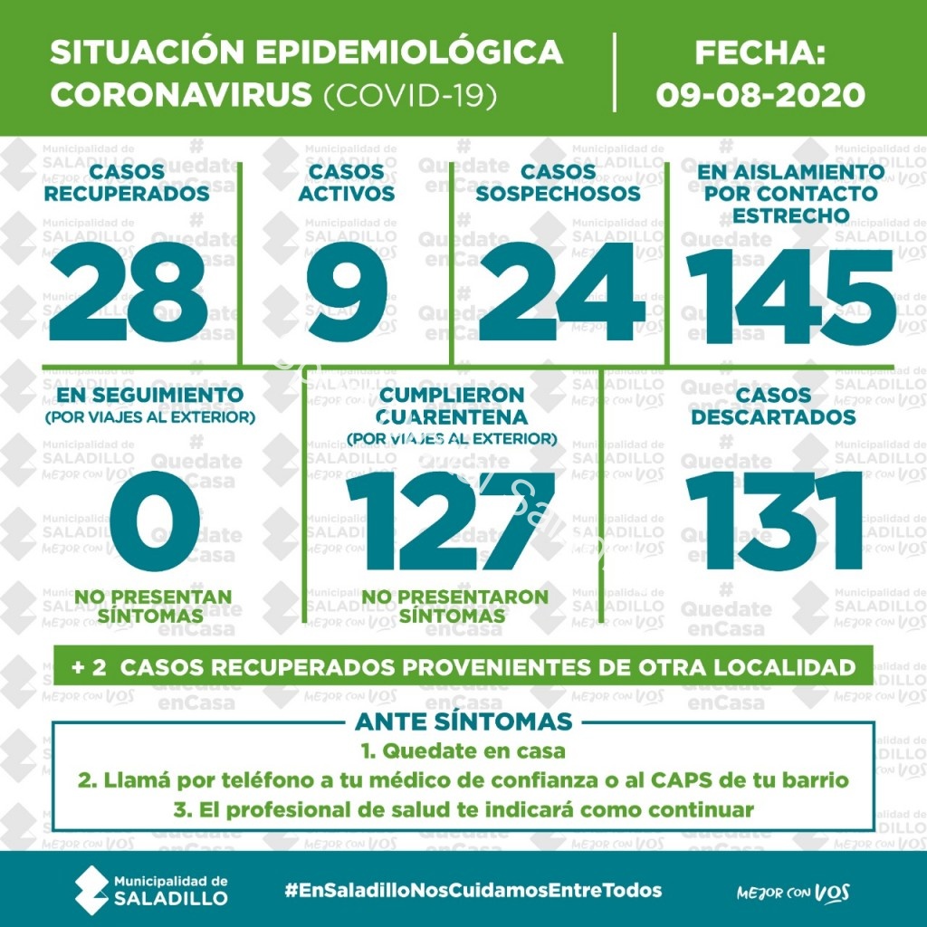 SITUACIÓN EPIDEMIOLÓGICA EN SALADILLO | 09/8/2020
