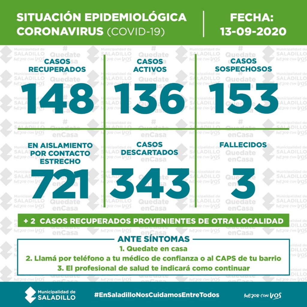 SITUACIÓN EPIDEMIOLÓGICA EN SALADILLO | 13/9/2020